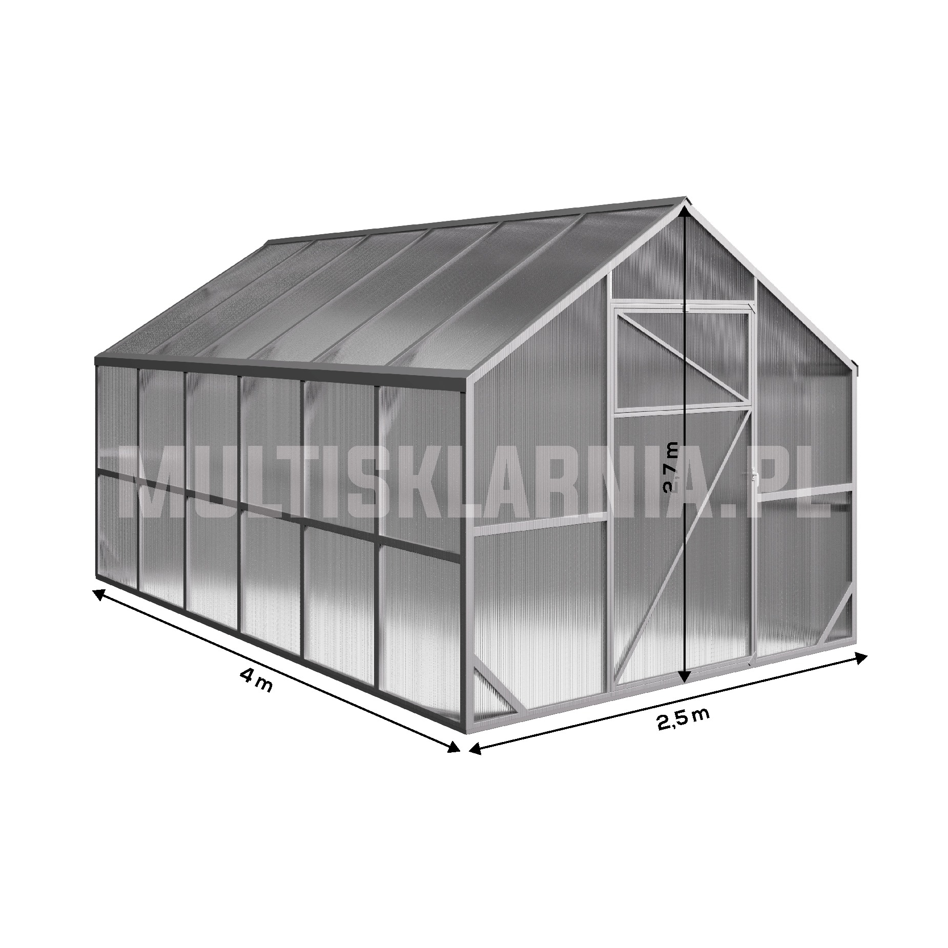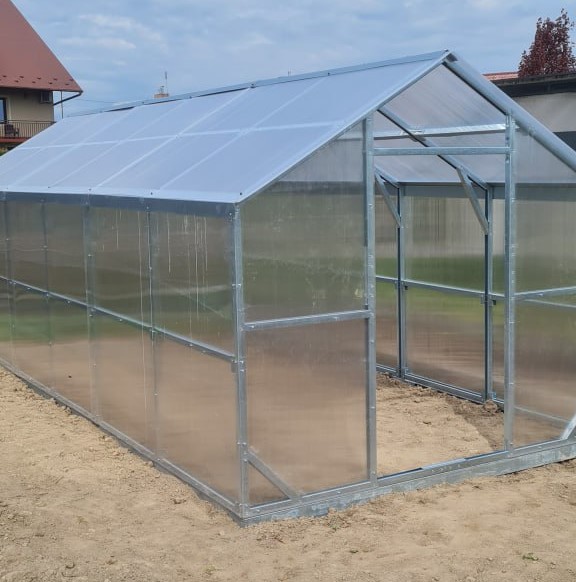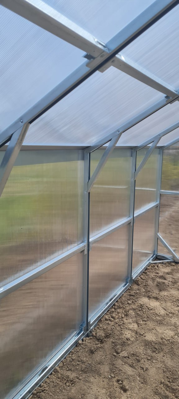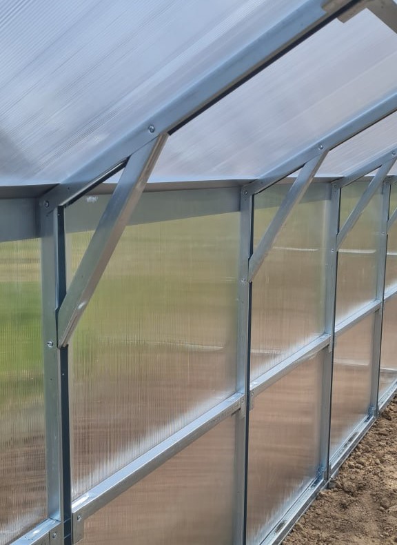 Rama kostrukcji wykonana jest z ocynkowanej stalowej rury kwadratowej (bez spoin) o przekroju 40×40 mm. Elementy ramy łączone są za pomocą śrub, a warstwa ocynku na całej powierzchni skutecznie zabezpiecza przed korozją. Minimalna długość szklarni to 4 metry, długość można łatwo zwiększyć, dokupując zestaw przedłużający o 2 metry.