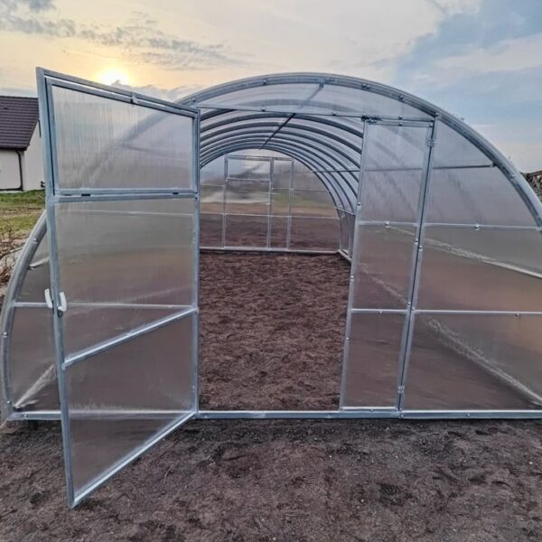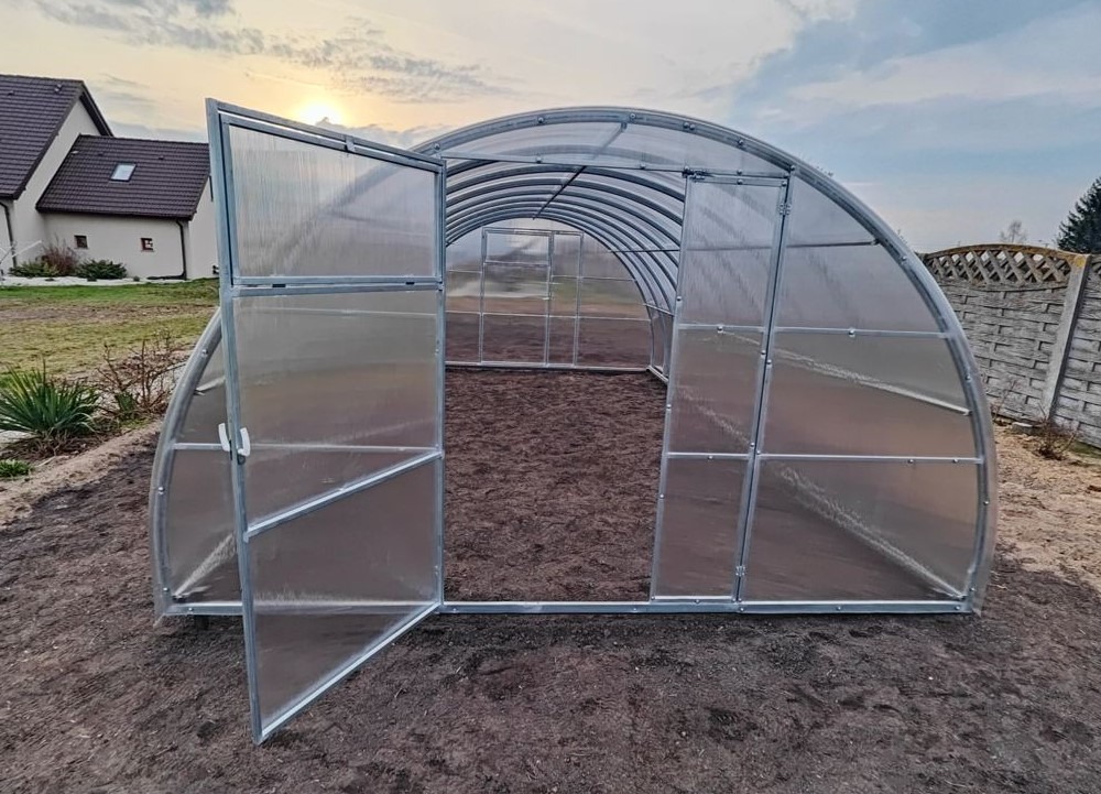 Dwuskrzydłowe drzwi o szerokości 1,30 m oraz okna wentylacyjne po obu stronach ułatwiają cyrkulację powietrza. Wytrzymała konstrukcja wytrzymuje obciążenie śniegiem do 180 kg/m² (co odpowiada 35-40 cm śniegu) oraz silne podmuchy wiatru. Owalny kształt dachu zapobiega zaleganiu śniegu. Ocynkowany profil od strony zewnętrznej i wewnętrznej doskonale zabezpiecza konstrukcję szklarni przed korozją.